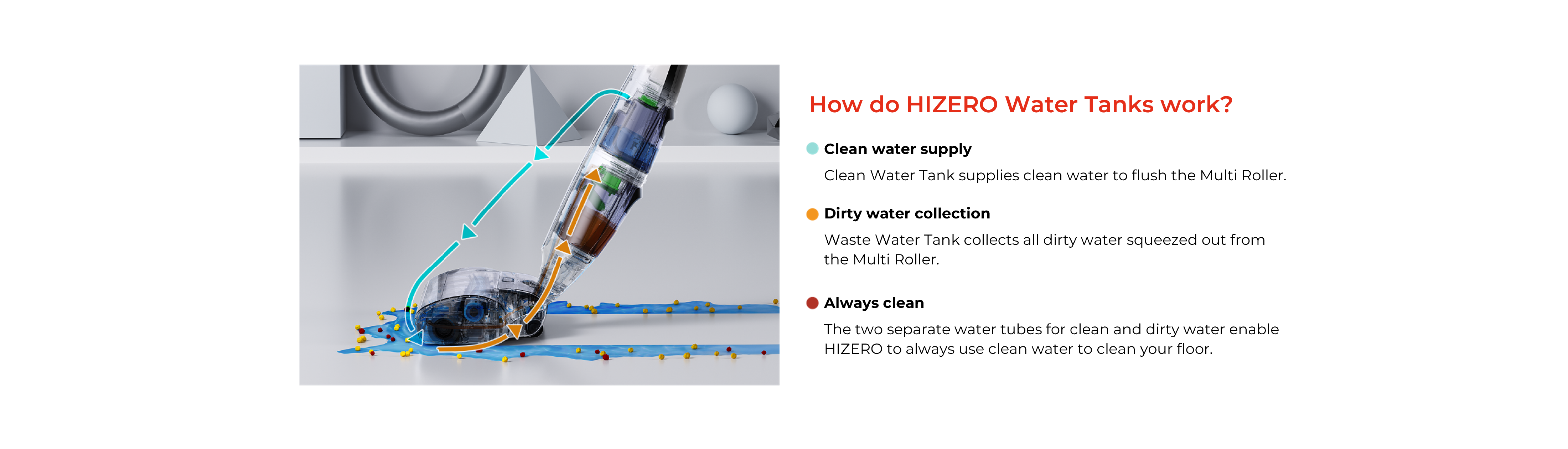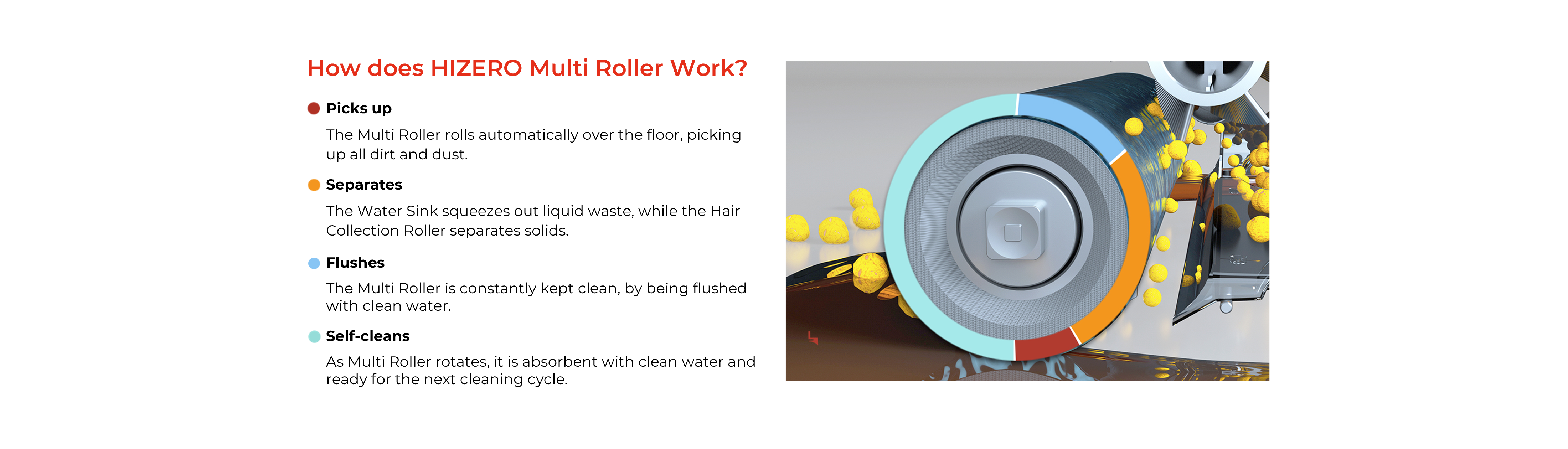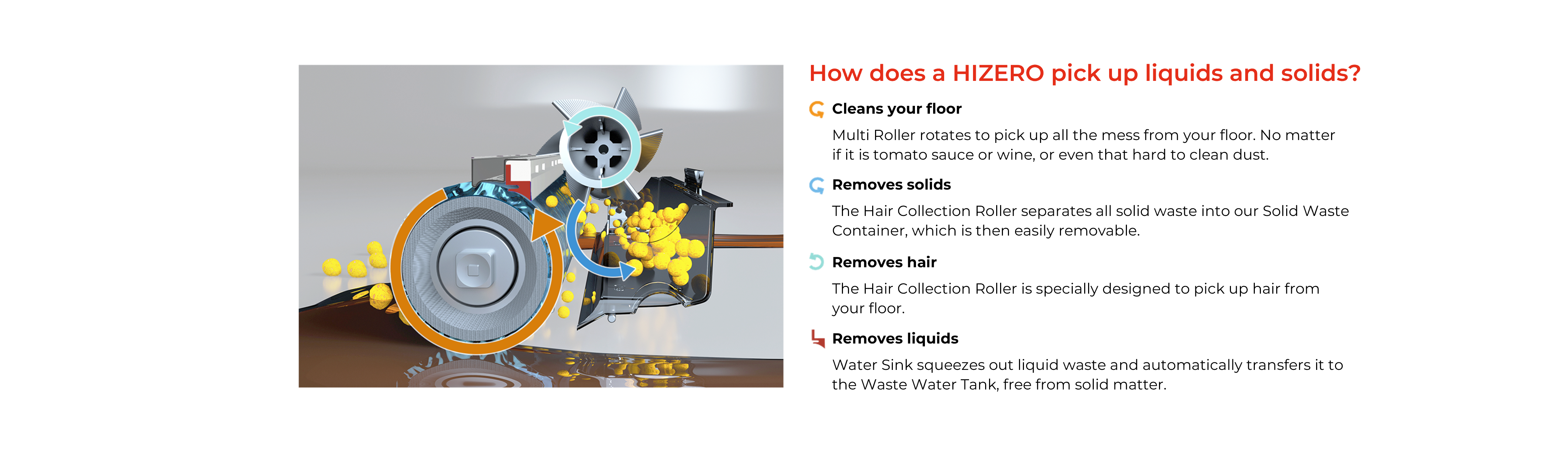 HIZERO introduces an innovative solid and liquid waste separation system. HIZERO makes waste disposal super easy by systematically separating the solids into a solid waste container and the liquids into HIZERO’s waste water tank. Hair and pet hair are also picked up and captured by our hair collection roller.